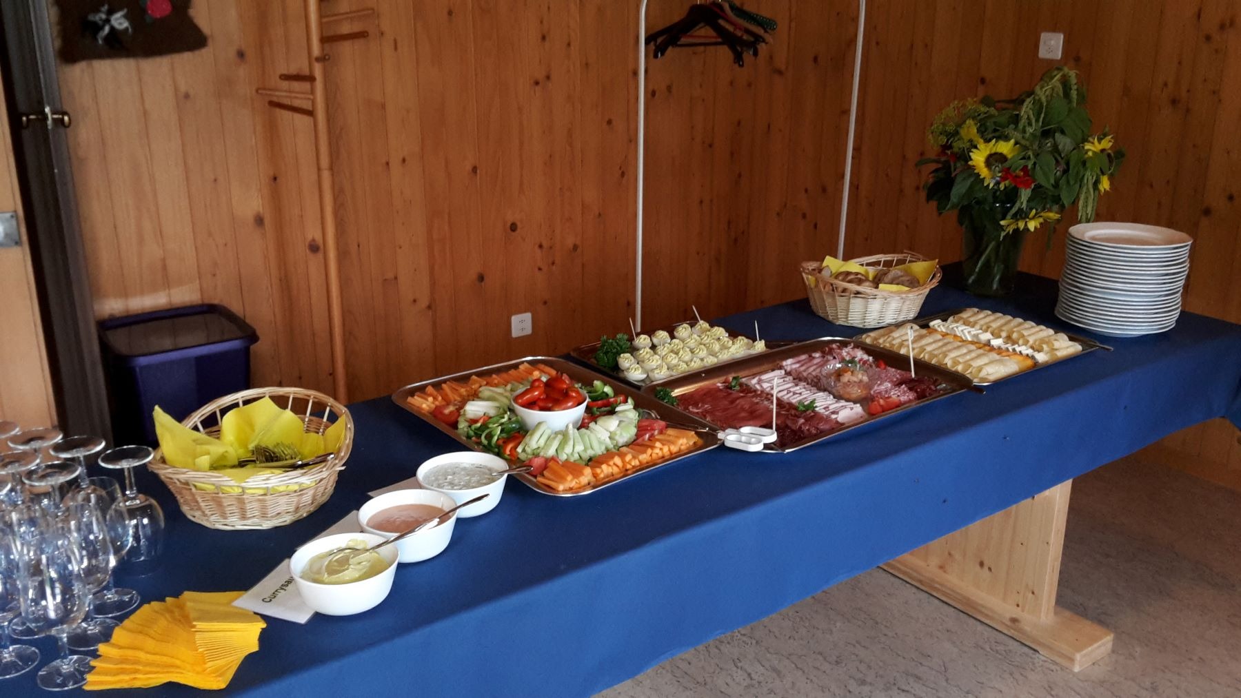 Brot, Züpfe, Konfitüre, Honig, Butter, Käse- und Fleischplatte, Rösti, Bratspeck, Franz. Omelette, Birchermüseli, Cerealien und Fruchtsalat, Früchtejoghurt, Naturejoghurt, Kaffe, Milch, Tee, Wasser, Apfelsaft